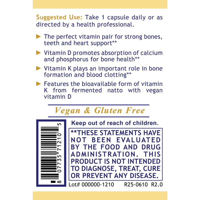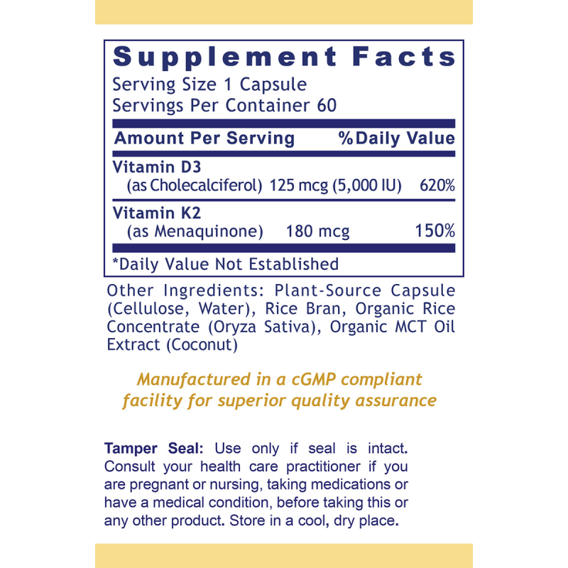 Each capsule provides 5,000 IU (125 mcg) of vitamin D3 and 180 mcg of vitamin K2 derived from fermented natto, one of the most bioavailable forms of K2 available. *