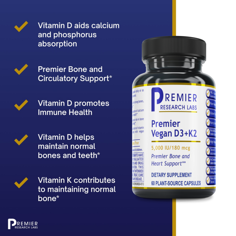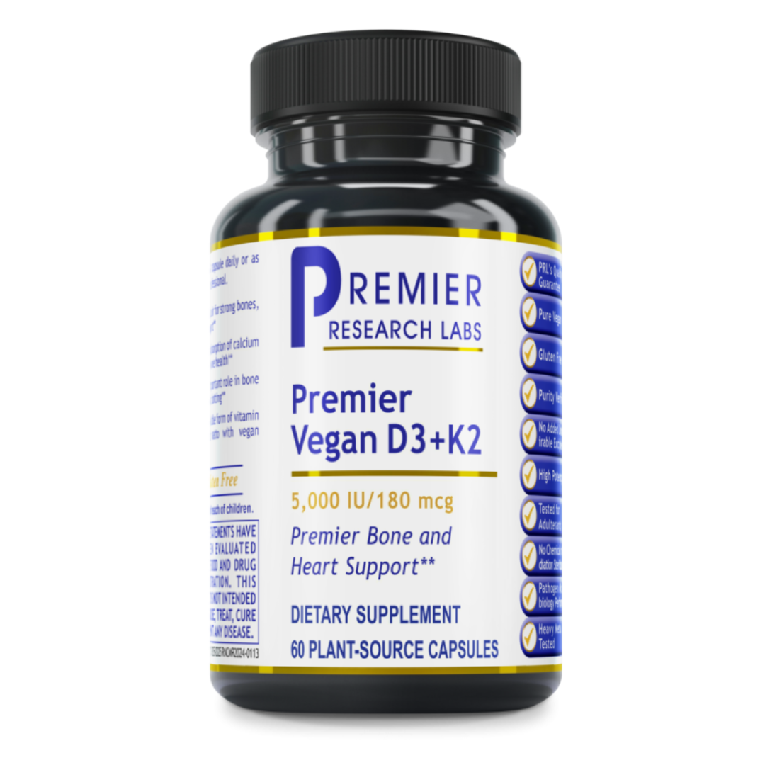 Premier Vegan D3+K2 is a high-potency, plant-based supplement delivering clinically relevant levels of vitamin D3 and vitamin K2 (as MK-7, the preferred form) to support bone health, calcium metabolism, and cardiovascular function. *